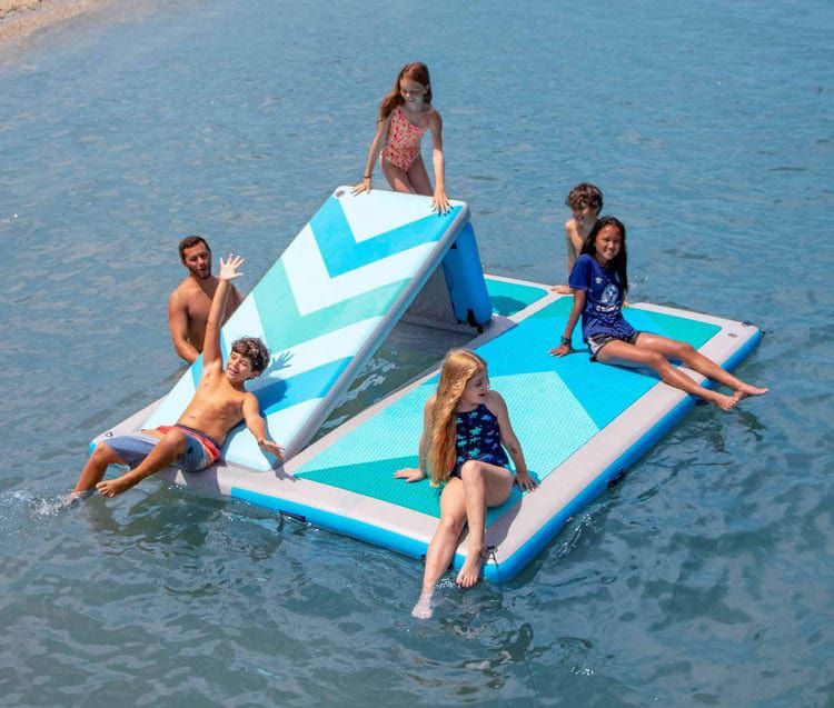 Материал ПФХ и Air-DeckНадувной причал размером 350 х200 см со встроенной горкой. Трансформируется из горки в плоскую док-станцию, вмещающую до 8 человек, с минимальными переворотами или опрокидыванием. Встроенная ступенчатая система размером 70 см, которая крепится с помощью регулируемых ремней.