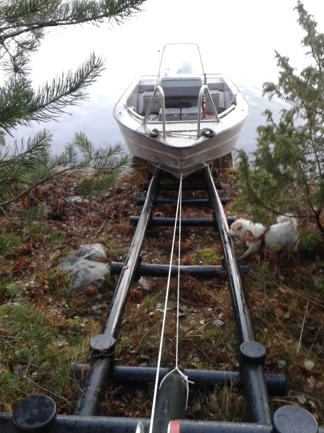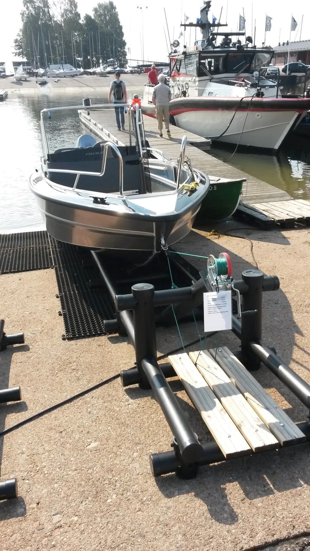 Заведите лодку на причал, зацепите швартовочный крюк за проушину и затяните лебедкой.