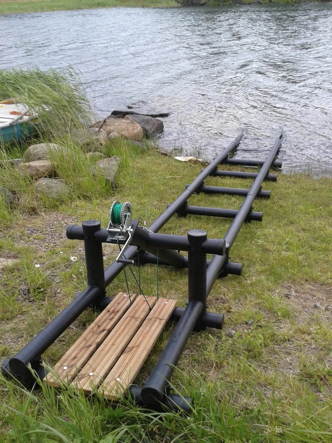 Легкий вес и модульность – вся конструкция весит 77 кг и состоит из 4 секций: три по 2,10 м и одна секция лебедки (2,40 м). Секции легко соединяются и разъединяются, поэтому причал можно переносить вручную или убирать на зиму.